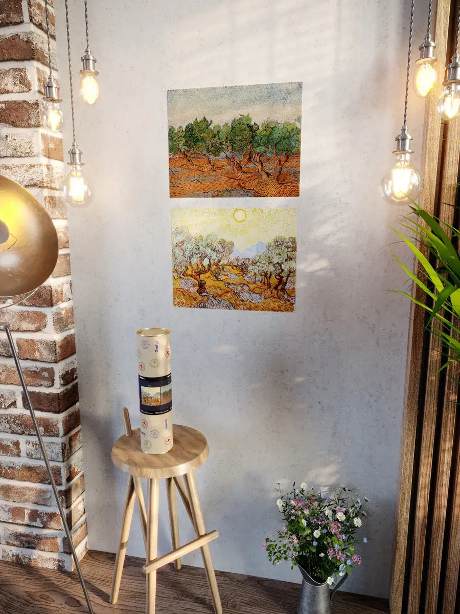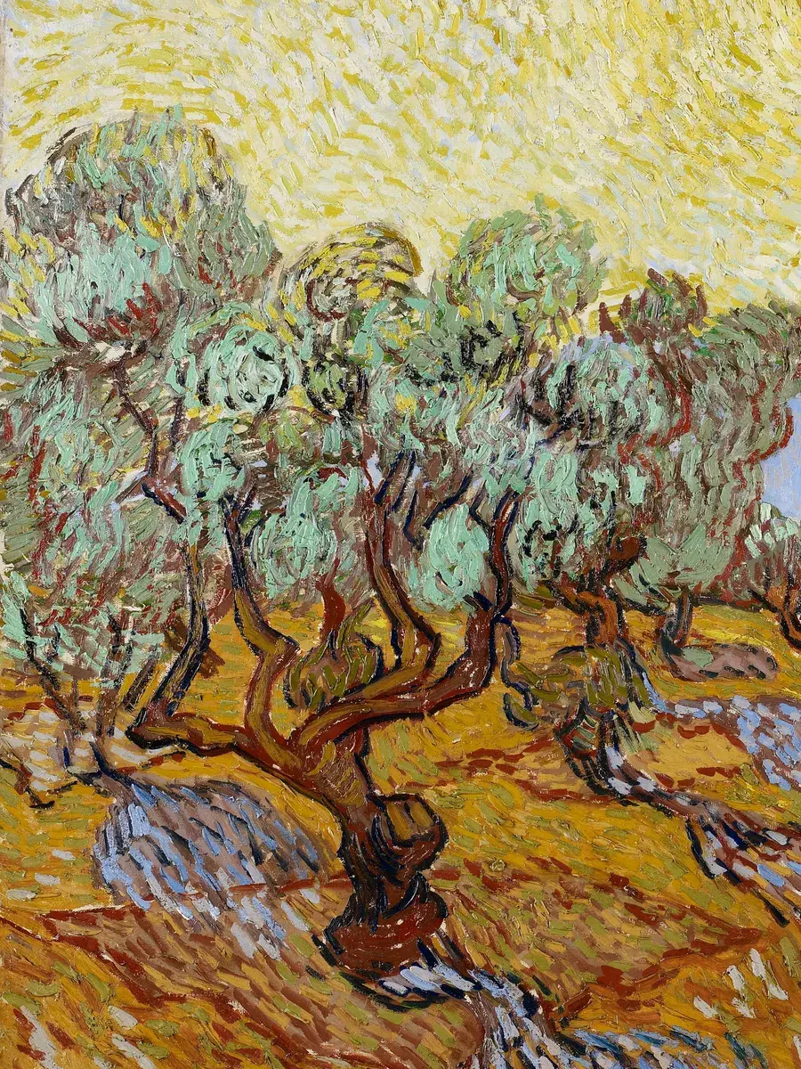 • Ван Гог "Оливковые деревья на фоне желтого неба и солнца" 38.6×30.8 см — Оригинал 73.6×92.7 см (1889 год) — Музей искусств Миннеаполиса, Миннеаполис, США
